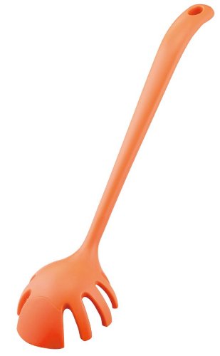 下向きに8本の指が付いている炒め物ターナーです。 ご飯の塊も、上から叩くようににほぐせます。 内側には食材の付きにくいエンボス加工。 ほぐすだけでなく、8本の指で 簡単に混ぜ合わせることが出来ます。炒め物や麺類など、混ぜ合わせるのに苦労する、 菜箸を何本も使うといった料理に最適です。 先端にはシリコン製のカキ取りヘラが付いており、 鍋側面に付いた食材を集めたり、 出来上がった料理を簡単にお皿に移せます。